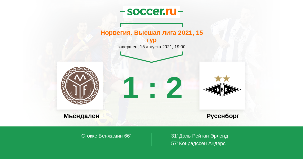 66' (1:2) Стокке Бенжамин (9) (Ларсен Ларс (7))