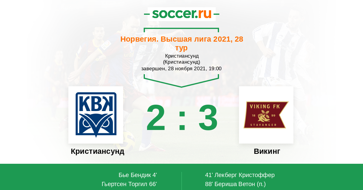 Гол90+3' (2:3) Бьоршол Сондре (18) (Квиа-Эгеског Симен (40))