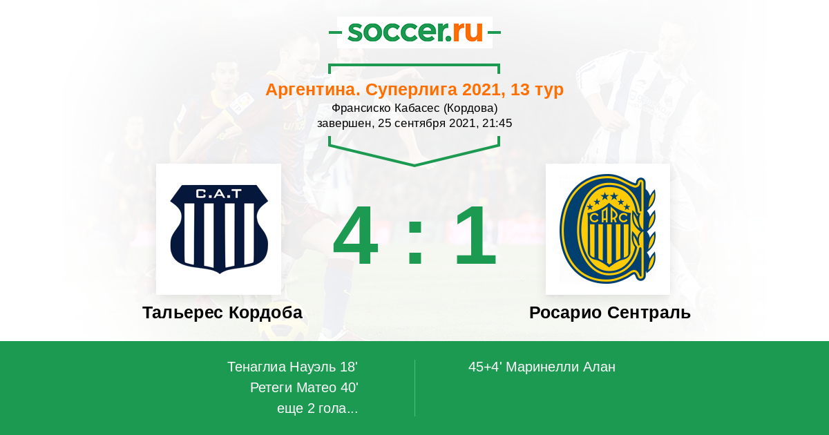 18' (1:0) Тенаглиа Науэль (14) (Вильягра Родриго (18))