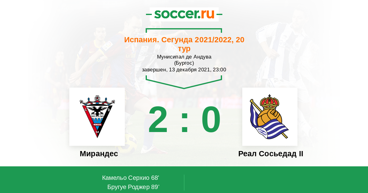 Аксиома: из двух слабых команд слабее будет та, которая играет на выезде. Так что шансы Мирандеса должны быть немного повыше, хотя Реал Сосьедад II очень неплохо выглядит на выезде. Мирандес играет для своих зрителей, за ним и победа.