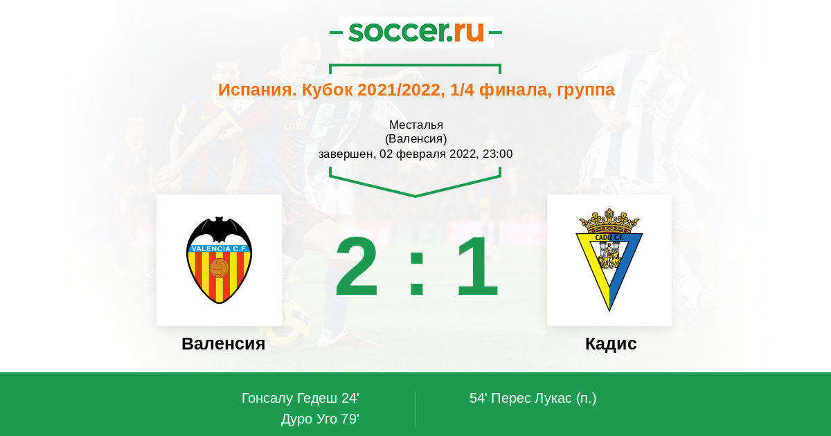 "Валенсия" – безусловный фаворит матча. "Кадис" собирался вылететь из Кубка Короля еще в Хихоне, но план немного не сработал. Команде Серхио Гонсалеса нужно сосредоточиться на сохранении прописки в Ла Лиге и 2 лишних матча ей совершенно точно ни к чему.