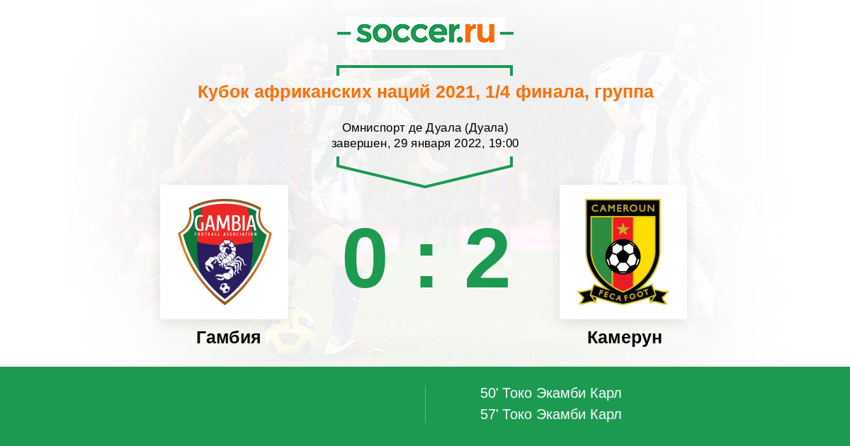 Сборная Гамбии по-прежнему является аутсайдером африканского футбола. То, что она пробилась в 1/4 финала Кубка Африки, — сродни чуду. Однако рано или поздно чудеса заканчиваются. Камерун силён, в квалификации ЧМ-2022 он доказал свою состоятельность. Пора показать мощь в Кубке африканских наций. Надеемся, в этот раз всё будет честно.