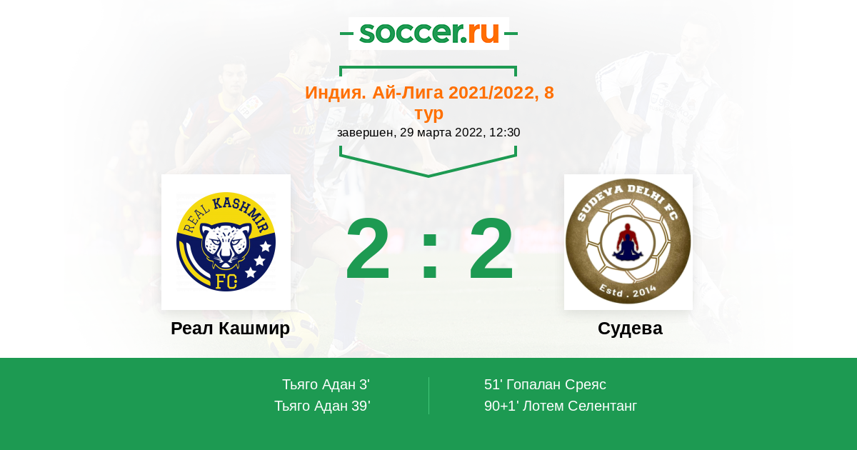 3' (1:0) Тьяго Адан (9) (Широдкар Пратеш (55))