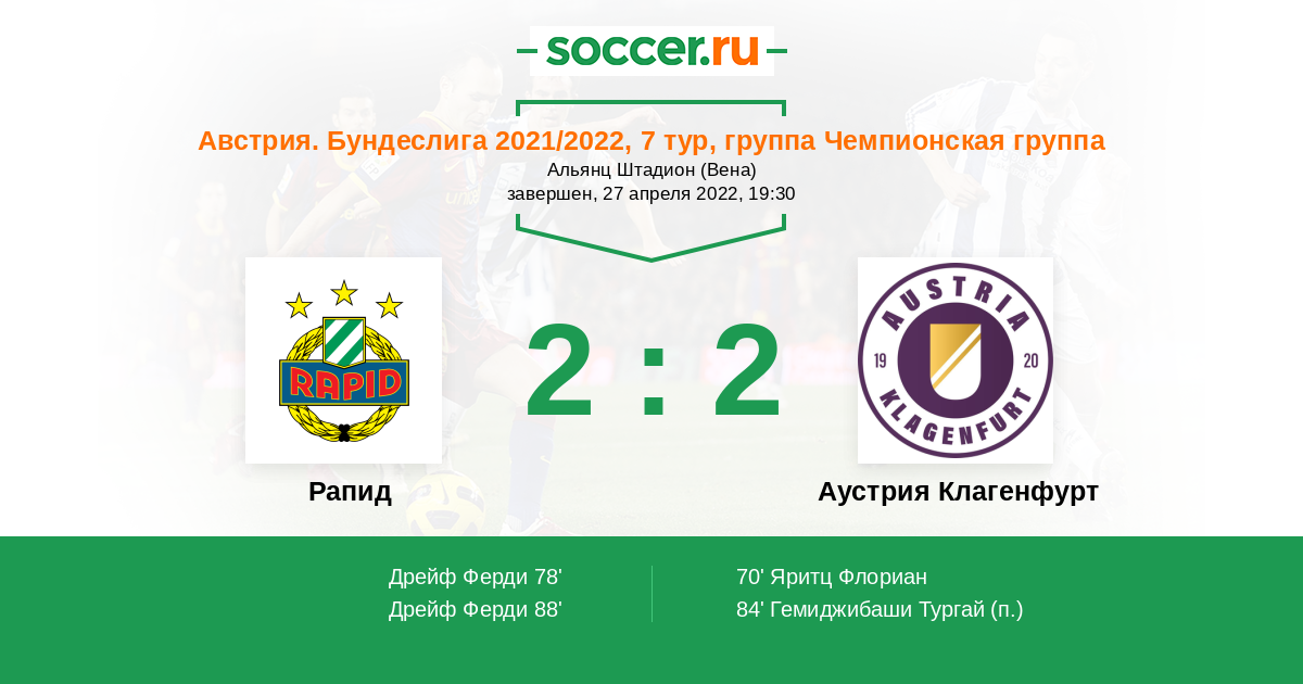 Тут венский Рапид имеет явное преимущество перед Аустрией Клагенфурт. Команда играет дома и нацелена занять третье место, их соперники же по сути уже довольны тем, что попали в первую шестерку.