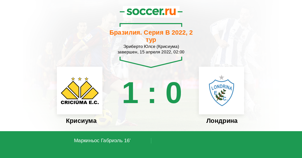 16' (1:0) Маркиньос Габриэль (10) (Зе Маркос (4))