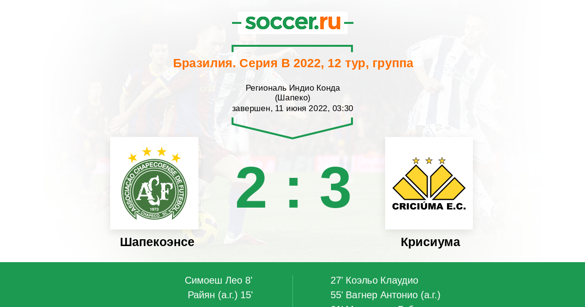 55' (2:2) Автогол Вагнер Антонио (1)