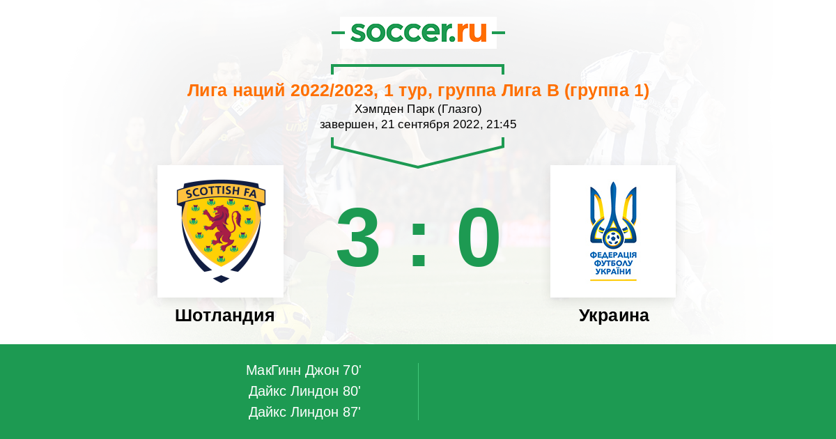 Матч этих сборных летом по xG Шотландия 1,7, Украина 1,78. Сейчас в сб. Украины очень серьезные потери, Зинченко, Шапаренко, Бущан (еще половину СМИ пишут, что и Миколенко не будет). Ярмоленко уже не в Вест Хэм, его форма под сомнением, Яремчук получает самую низкую оценку в последнем поединке за Брюге. За Шотландию., Мак Гин, Адамс, Армстронг, все игроки на ведущих позициях в своих клубах АПЛ, и в хорошей физической форме.