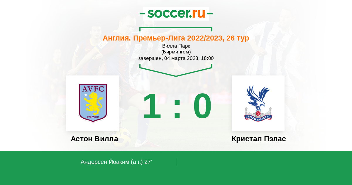 27' (1:0) Автогол Андерсен Йоаким (16)