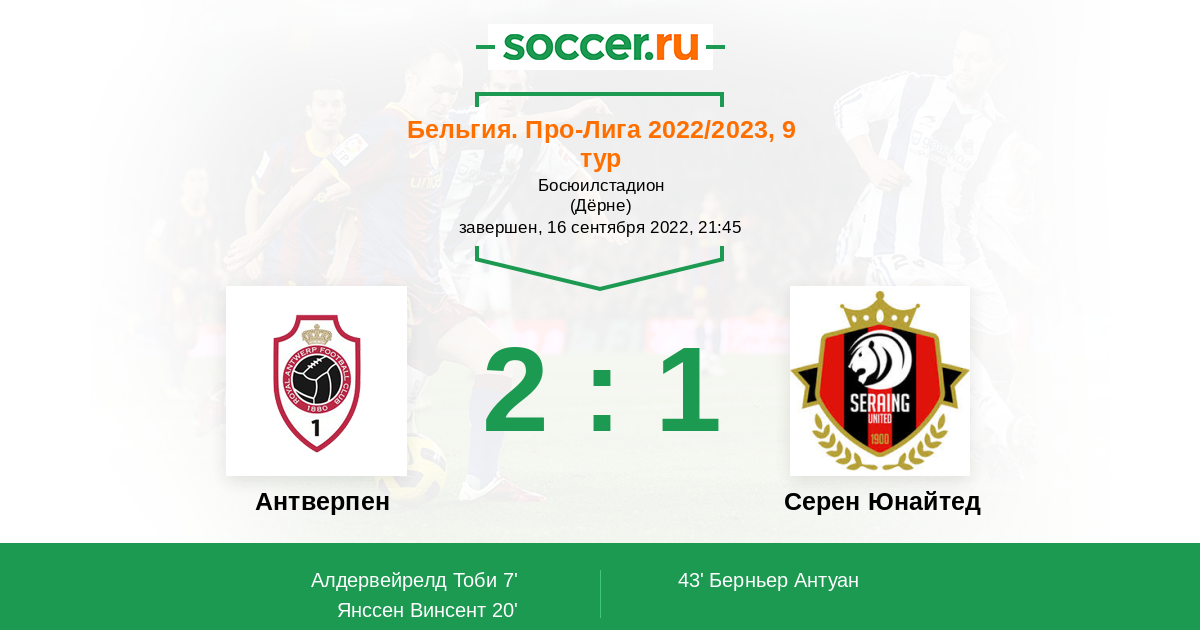 В Бельгии сейчас надо ставить на Антверпен в любой игре, хоть дома хоть на выезде. Эта команда побеждает всегда. А уж в матче с одним из аутсайдеров Серен Юнайтед, другого результата, кроме победы Антверпена предположить трудно.