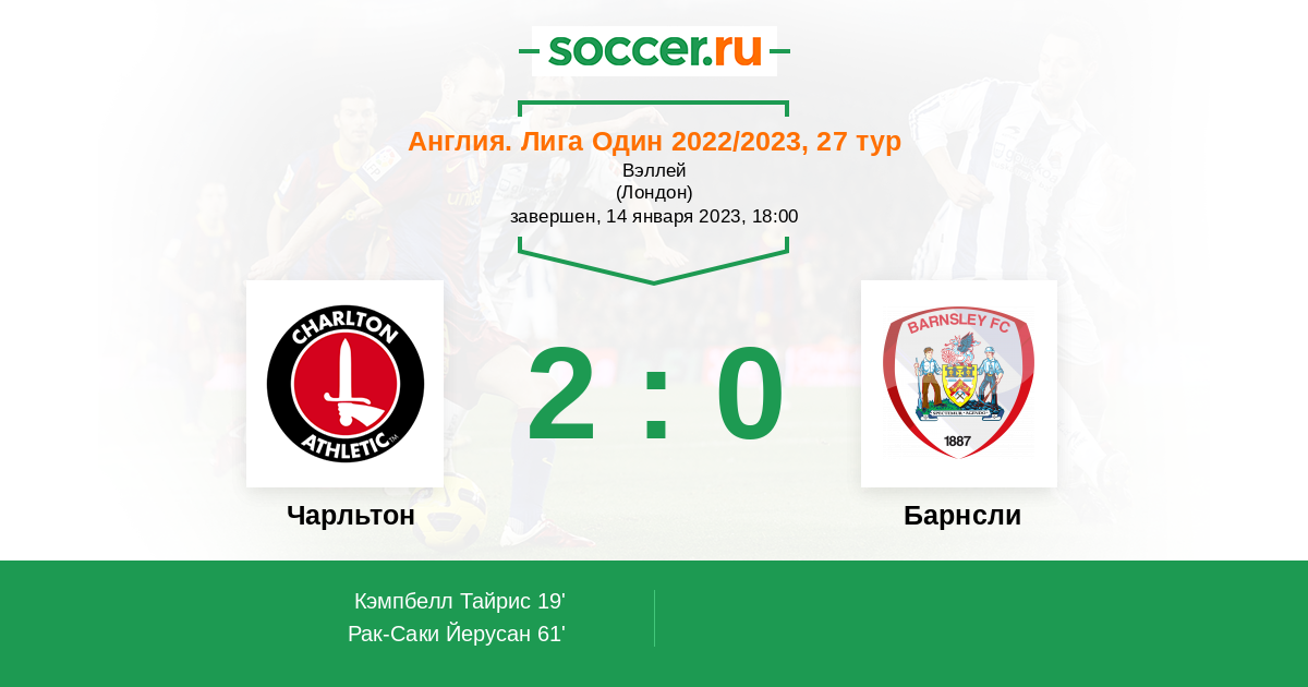 19' (1:0) Кэмпбелл Тайрис (43) (Пейн Джек (19))