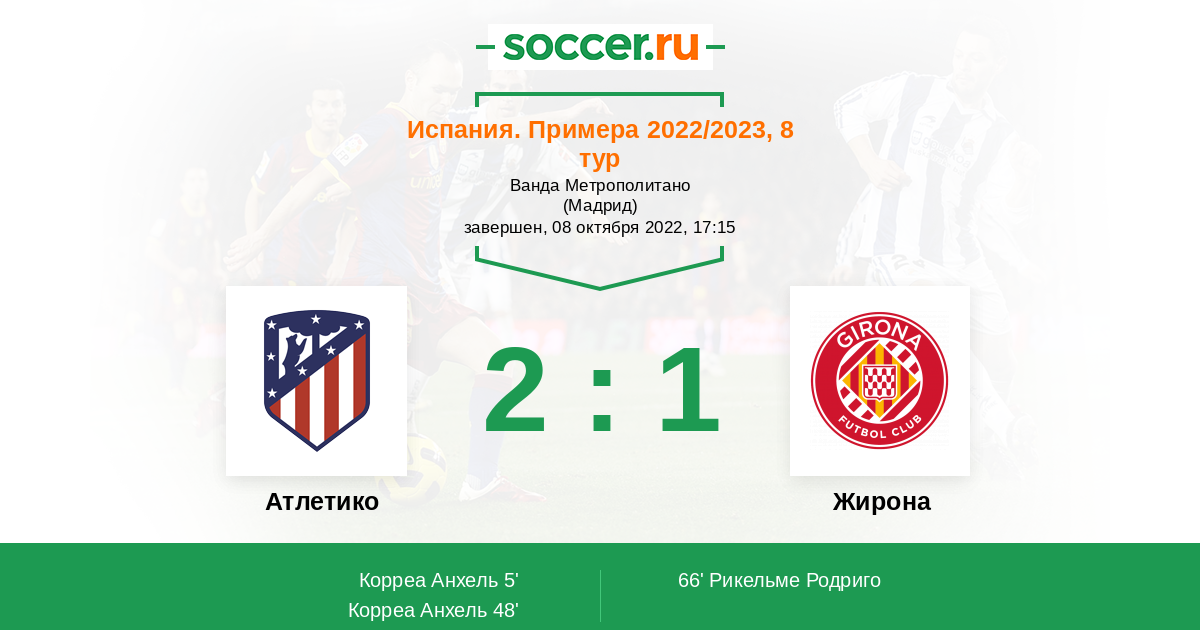 В этом матче между командами Атлетико Мадрид и Жирона фаворитом является команда хозяев поля. Которые в долгу перед своими болельщиками и готвы будут сделать всё чтобы порадовать их сегодня на своём поле. Удачи