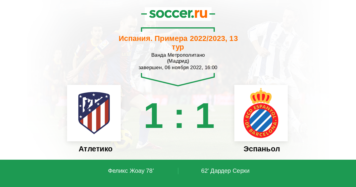 В предстоящем матче 13 - го тура испанской Ла Лиги между командами Атлетико Мадрид и Эспаньол Барселона , фаворитом на победу является команда хозяев Атлетико Мадрид , так как они играют дома. И Атлетико Мадрид сейчас как раненный волк... После позорного вылета из ЛЧ на групповом этапе.