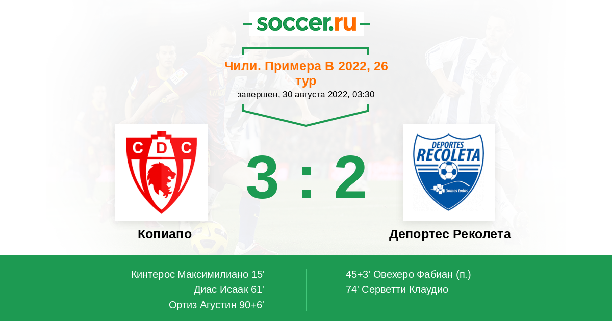 В предстоящем матче 26 - го тура чилийской Примеры В между командами Копиапо и Депортес Реколета , явным фаворитом на победу является команда хозяев Копиапо , так как они играют убедительнее.