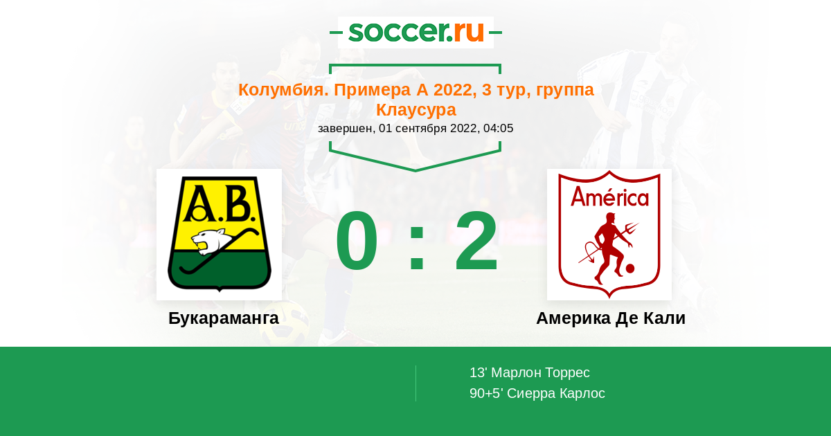 13' (0:1) Марлон Торрес (2) (Сиерра Карлос (4))