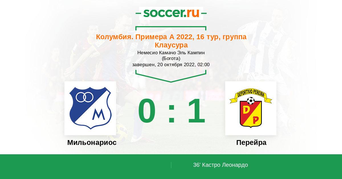 36' (0:1) Кастро Леонардо (23) (Москера Жерсон (6))