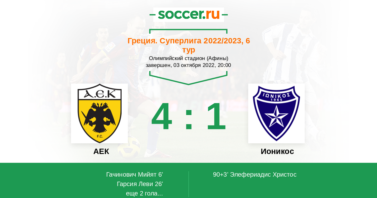 Я думаю что в этом противостоянии более чем явным фаворитом на победу является команда хозяев поля АЕК . Команда гостей Ионикос является явным аутсайдером и не выиграла ещё ни одной игры в пяти матчах.
