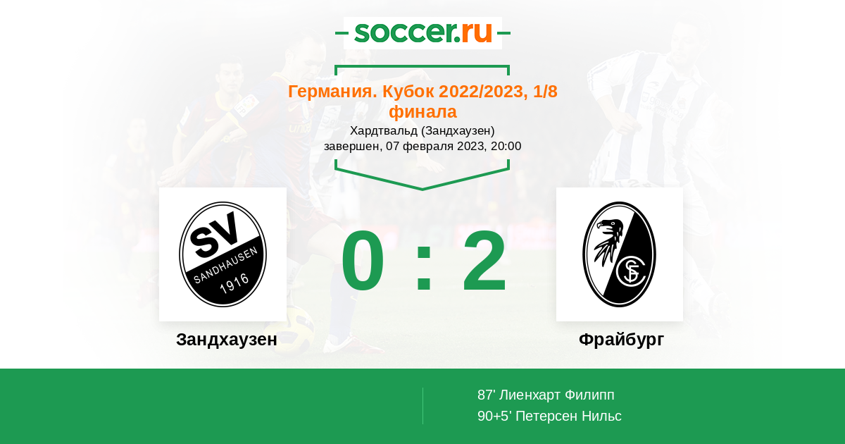 Зандхаузен - Фрайбург! Гости потерпевшие несколько чувствительных неудач в Бундеслиги постараются реабилитировать себя в Кубке. Хозяева в свою очередь не очень хорошо выступающие в чемпионате тоже будут рвать и метать. Кубковый матч есть риск, что будет много борьбы, мало футбола, но всё же ТБ.
