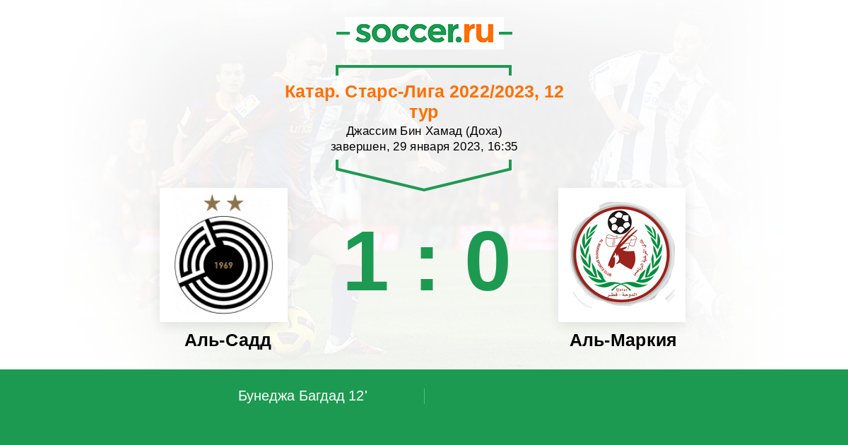 12' (1:0) Бунеджа Багдад (11) (Мосааб Кходер (70))