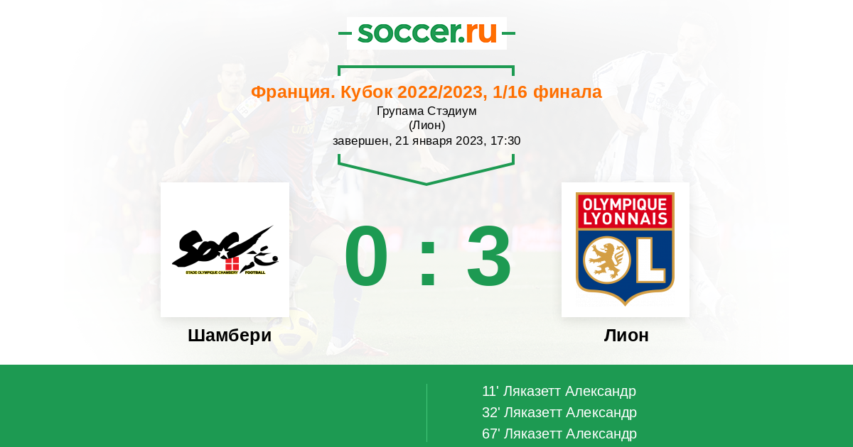 11' (0:1) Ляказетт Александр (10) (Тете (11))