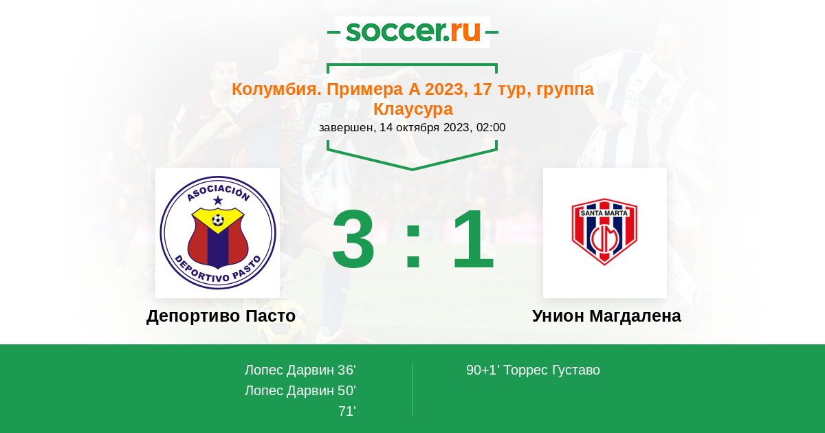 90+1' (3:1) Торрес Густаво (11) (Камарго Исаак (9))