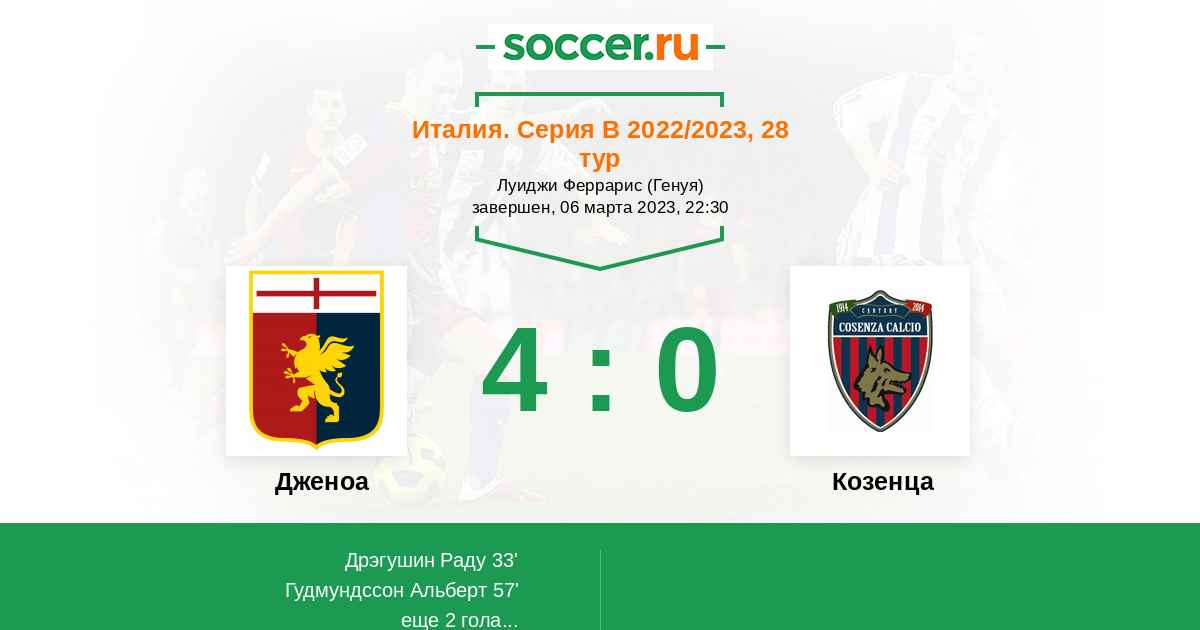 В этом матче между командами Дженоа и Козенца фаворитом является команда хозяев поля. Которые продолжают бороться за второе место в чемпионате. Позволяющие выходить на прямую в Серию А. Прогноз победа команды хозяев поля в этой игре. Удачи