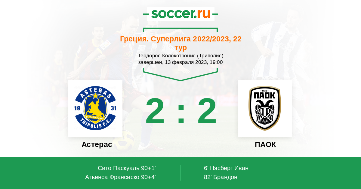 Гол90+4' (2:2) Атьенса Франсиско (18) (Тасулис Христос (3))