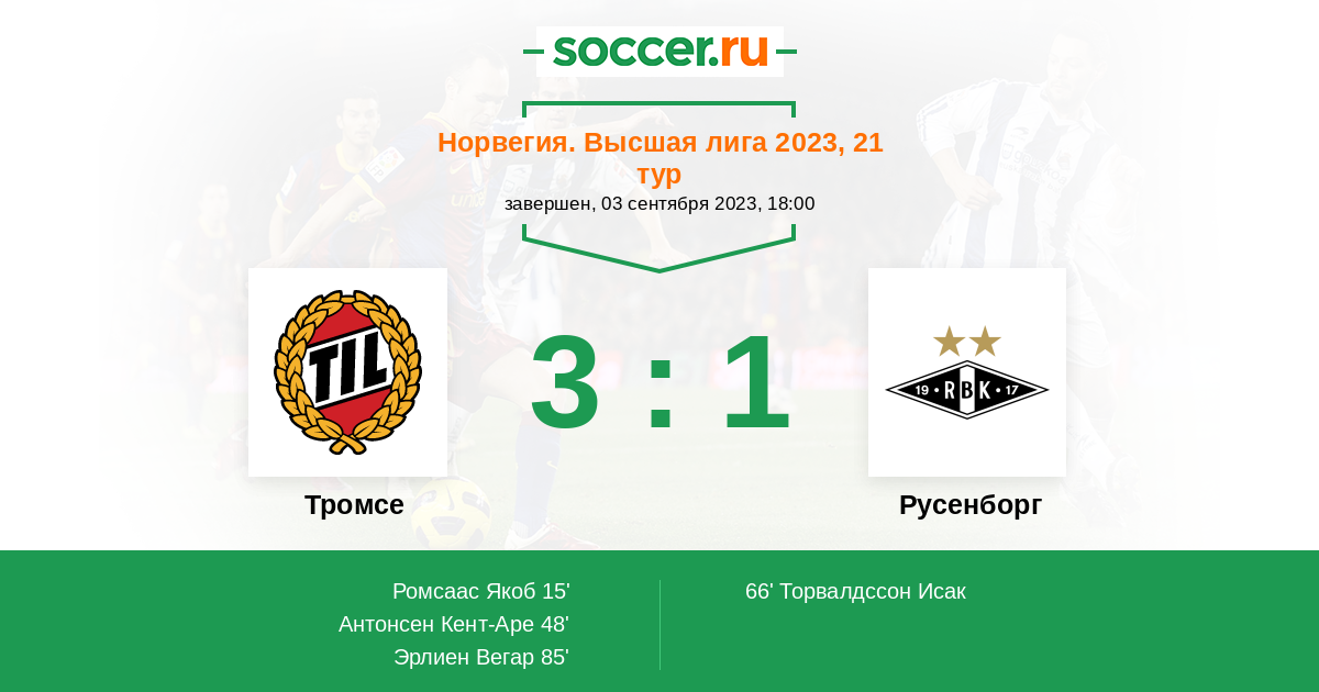 15' (1:0) Ромсаас Якоб (10) (Вестерлунн Никлас (19))