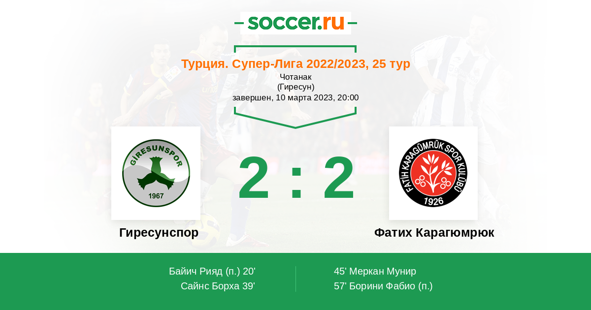 Я думаю что в этом противостоянии более чем явным фаворитом на победу выглядит команда гостей Фатих Карагюмрюк . Но и команда хозяев поля Гиресунспор которая находится среди аутсайдеров не будет мальчиками для битья и даст бой команде гостей . Команда гостей под руководством Андрео Пирло после зимней паузы не проиграла ни одного матча , не думаю что команде из нижней части турнирной таблицы они смогут проиграть .