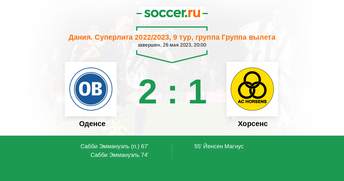 74' (2:1) Сабби Эммануэль (11) (Фрокьяер-Йенсен Мадс (29))