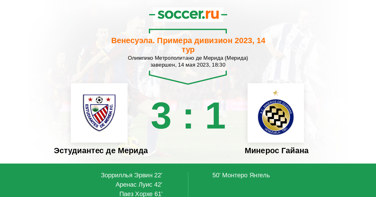42' (2:0) Аренас Луис (16) (Зорриллья Эрвин (28))