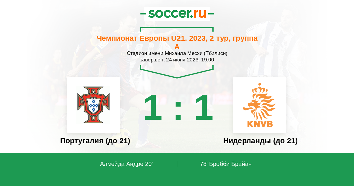 Чемпионат Европы U21. 2-й тур. Групповая стадия. Сборная Португалии у себя дома играет против сборной Нидерланды. Португалия ужасно стартовала на этом турнире, проиграли 0-2 на выезде сборной Грузии. Нидерланды тоже не очень то уж и хороши, у себя дома сыграли против Бельгии 0-0. Мой прогноз: Ничья, либо победа Португалии 2-1)))