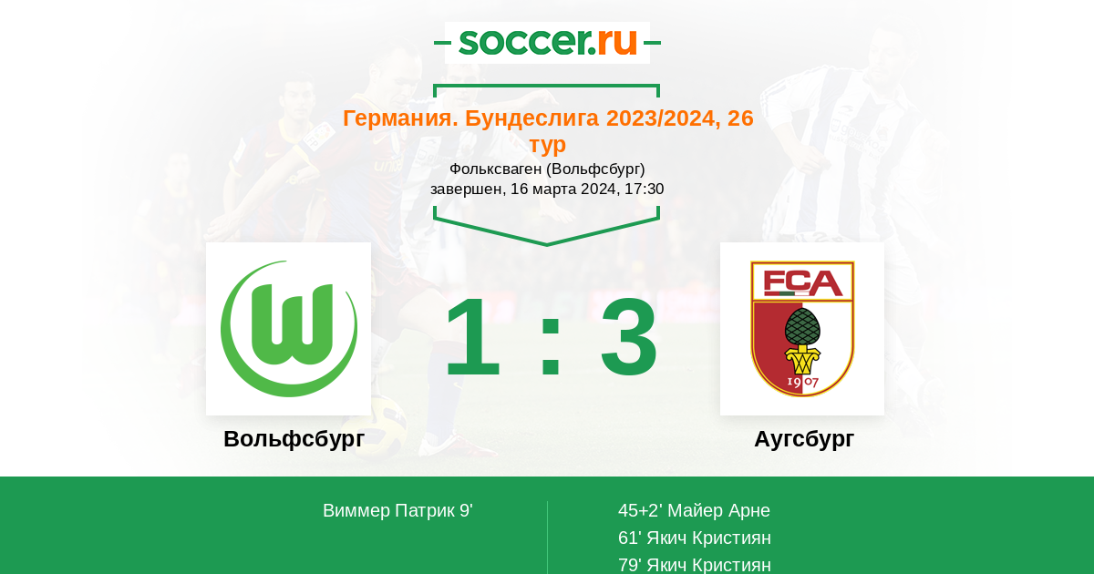 Аугсбург в таблице располагается на девятой строчке, являясь очень крепким середняком в Бундеслиге текущего сезона. Так высоко для себя подняться подопечные Йесса Торупа смогли благодаря победной серии из трёх поединков кряду: над Фрайбургом (2-1), Дармштадтом (6-0) и Хайденхаймом (1-0). Как видите, с атакой у "фуггеров" всё в порядке. Но если вдруг по перечисленным матчам вам показалось, что Аугсбург очень надёжно обороняется, то это далеко не так. Ведь до победной серии команда имела такие результаты: ничьи с Бохумом (1-1) и Лейпцигом (2-2), поражения от Баварии (2-3) и Майнца (0-1). Не знаю, смогут ли гости продлить безвыигрышную серию "волков", но как минимум один гол в ворота хозяев они организовать вполне способны.