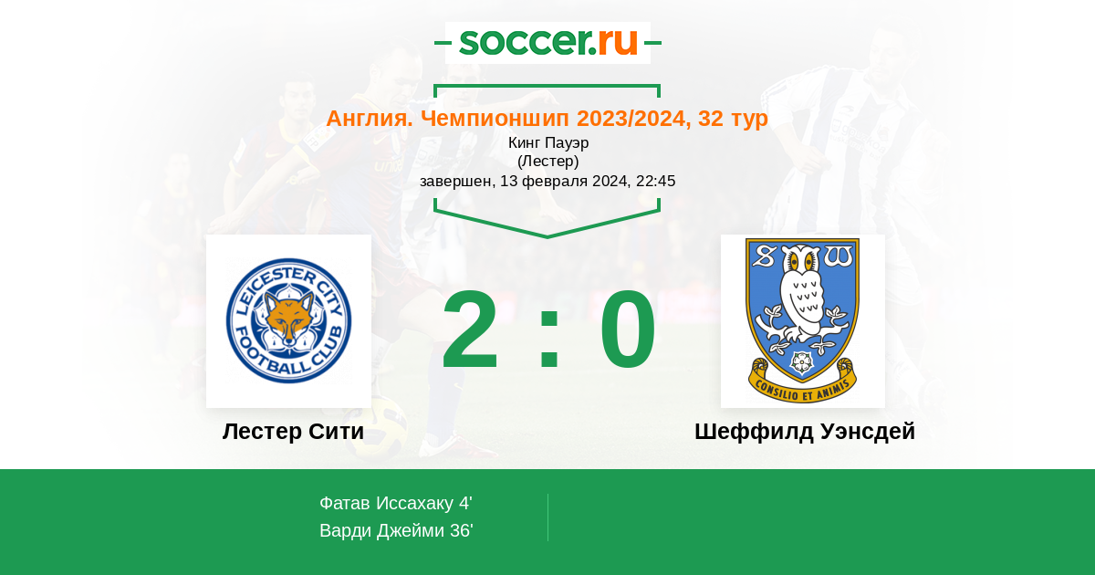 36' (2:0) Варди Джейми (9) (Дьюсбери-Холл Кирнан (22))