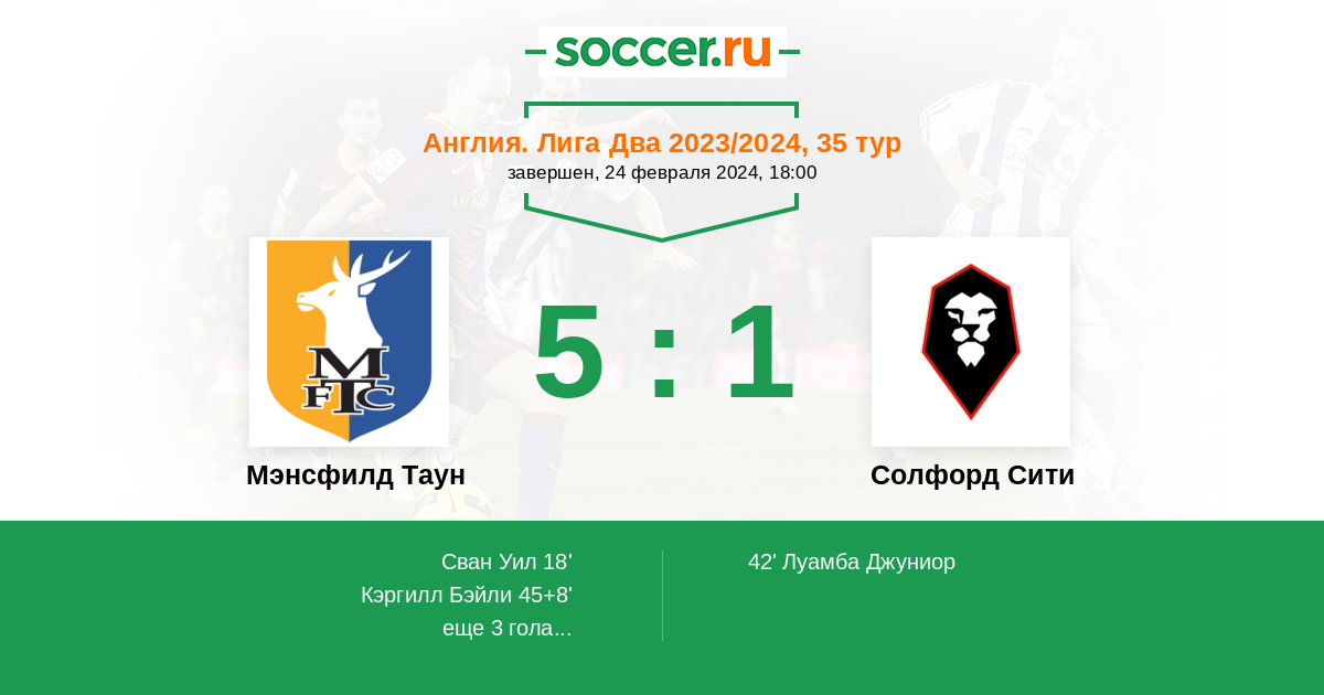 18' (1:0) Сван Уил (26) (Уильямс Джордж (22))