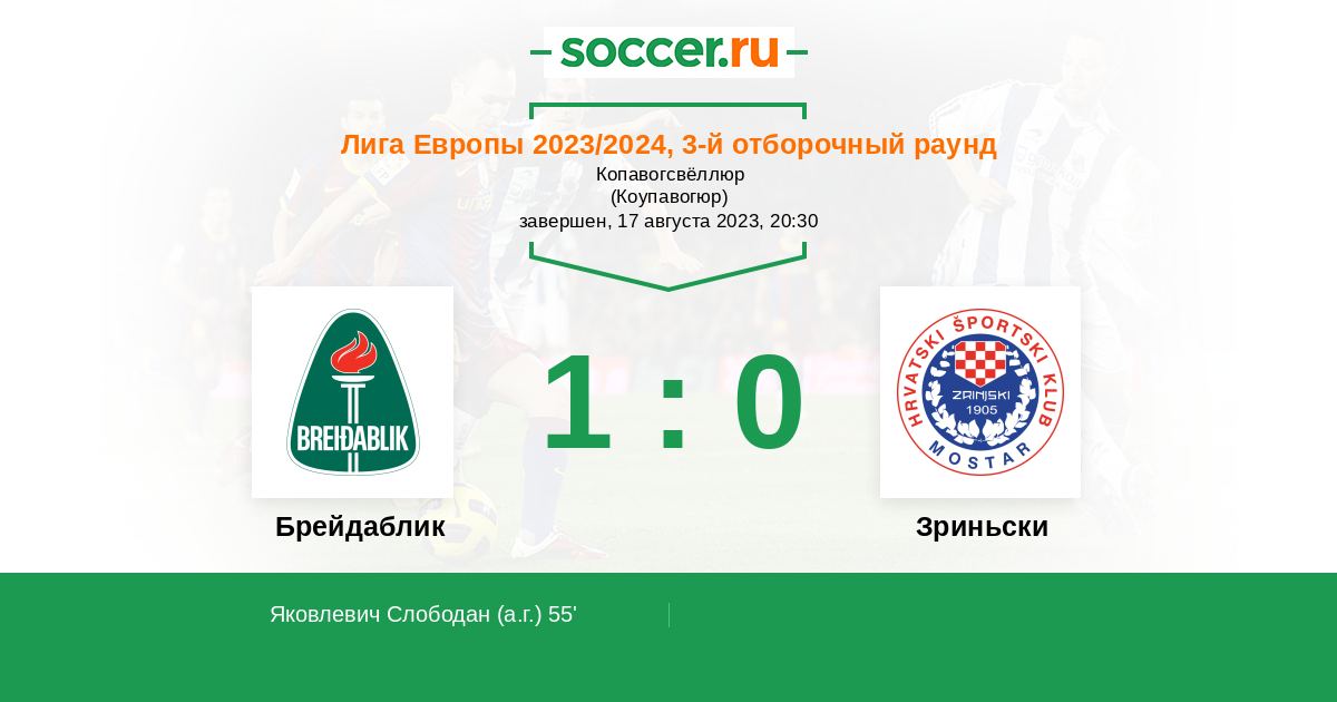 Брейдаблик - Зриньски ! Команды в первом матче показали завидную результативность . Конечно у исландцев отыграть 4 мяча вряд ли получится , но сыграть на победу они могут попытаться . Ну а гости как видели забивать умеют . ТБ .