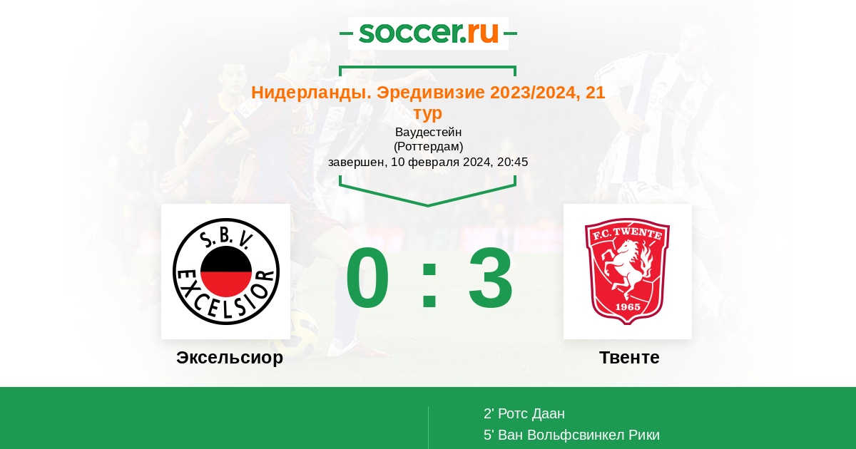 В сегодняшнем матче голландского Эредивизие между командами Эксельсиор и Твенте, не взирая на домашнее преимущество хозяев, смею предположить победу гостей, потому как их атака значительно результативнее, но и хозяева забьют.