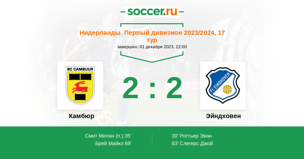 83' (2:2) Слегерс Джой (11) (Роттьер Эван (22))