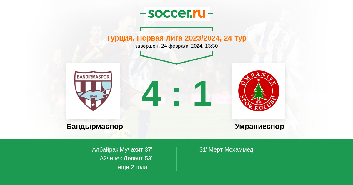 66' (4:1) Мимароглу Метехан (9) (Чеченоглу Мустафа (77))