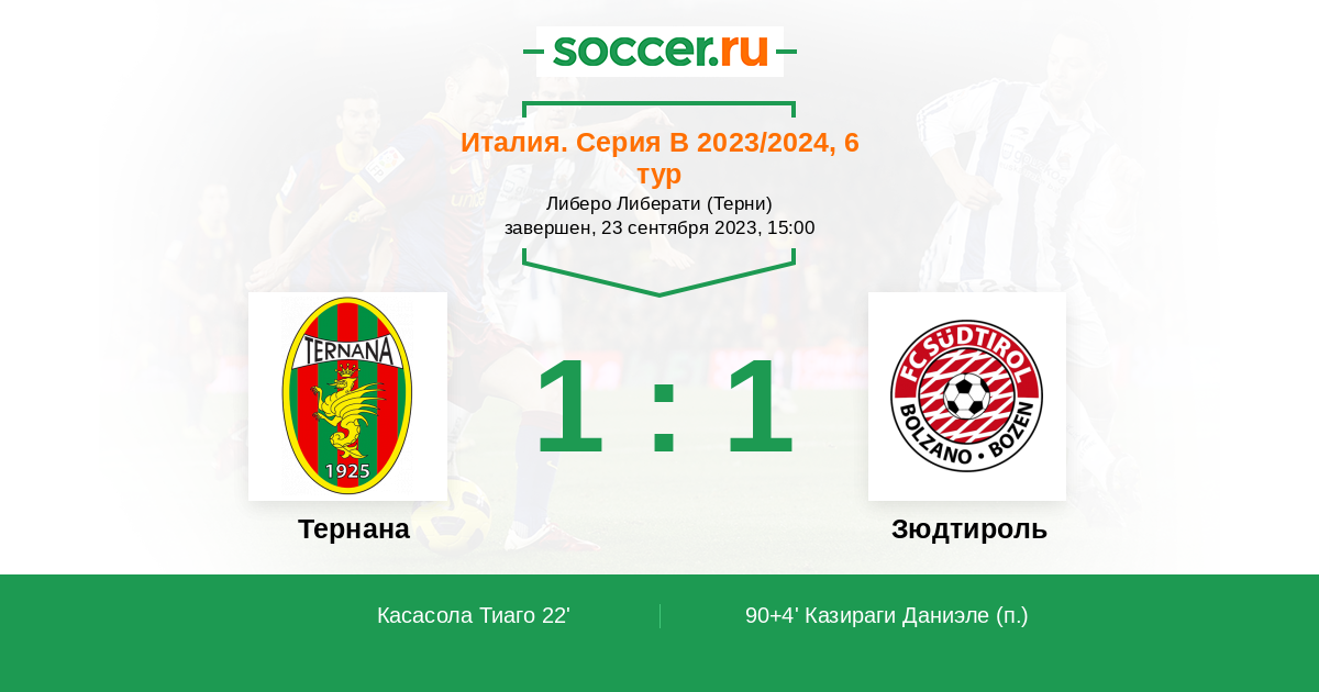 22' (1:0) Касасола Тиаго (15) (Фаллетти Сезар (10))