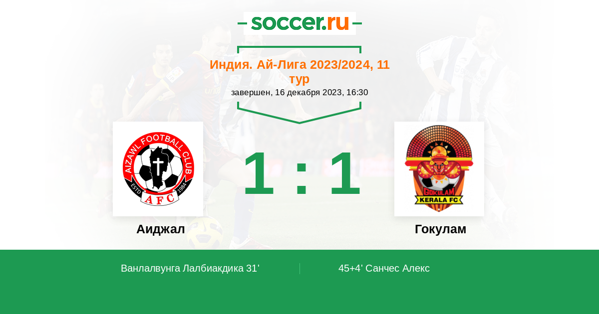 31' (1:0) Ванлалвунга Лалбиакдика (32) (Лалринфела К (10))