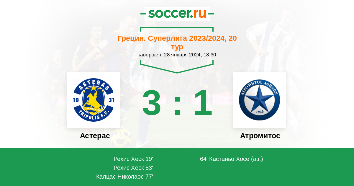 19' (1:0) Рехис Хеск (11) (Калцас Николаос (20))