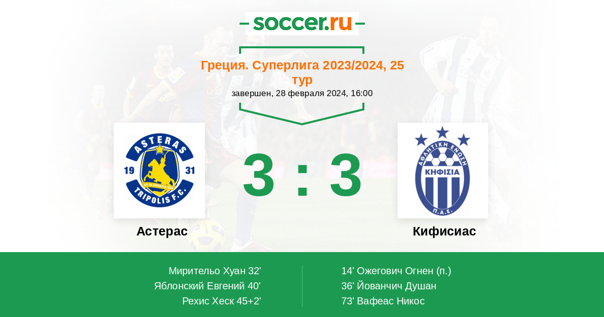 45+2' (3:2) Рехис Хеск (11) (Калцас Николаос (20))