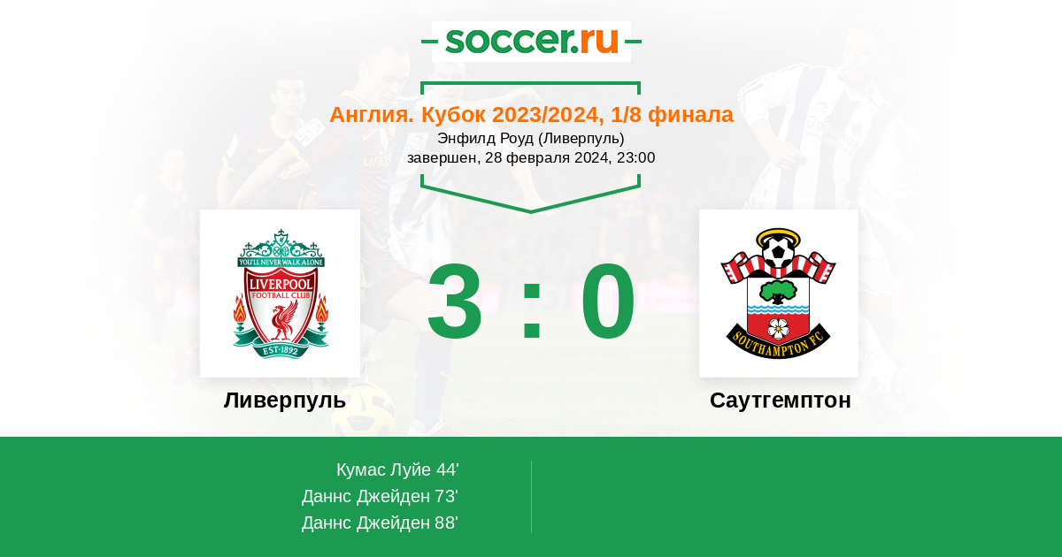 У Ливерпуля 99% на проход дальше. Саутгемптон не составляет угрозу Ливерпулю который уже выиграл свой первый трофей в этом сезоне Я уверен что забьёт Луис Диаз он как раз проводит отличный сезон. Но у Ливерпуля есть проблема это травмы большая часть игроков травмированы но Ливерпуль все равно не проиграл уже 4 последних игры!!