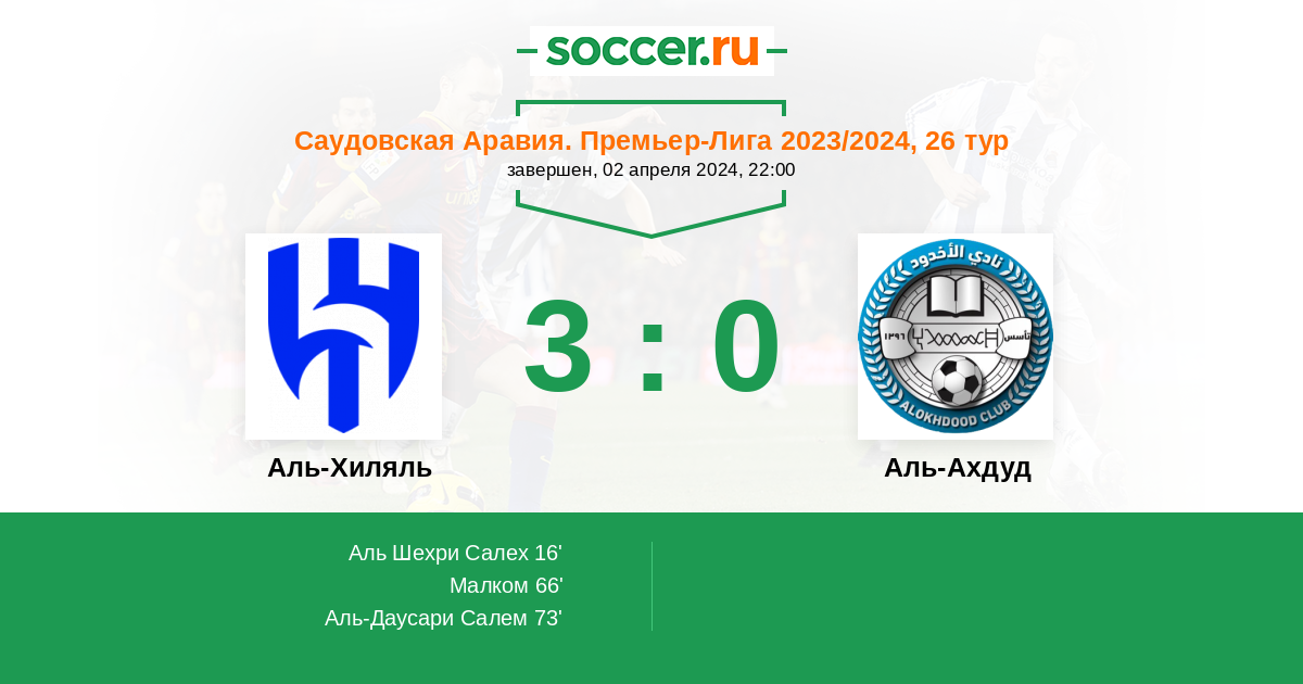 66' (2:0) Малком (77) (Аль-Даусари Салем (29))
