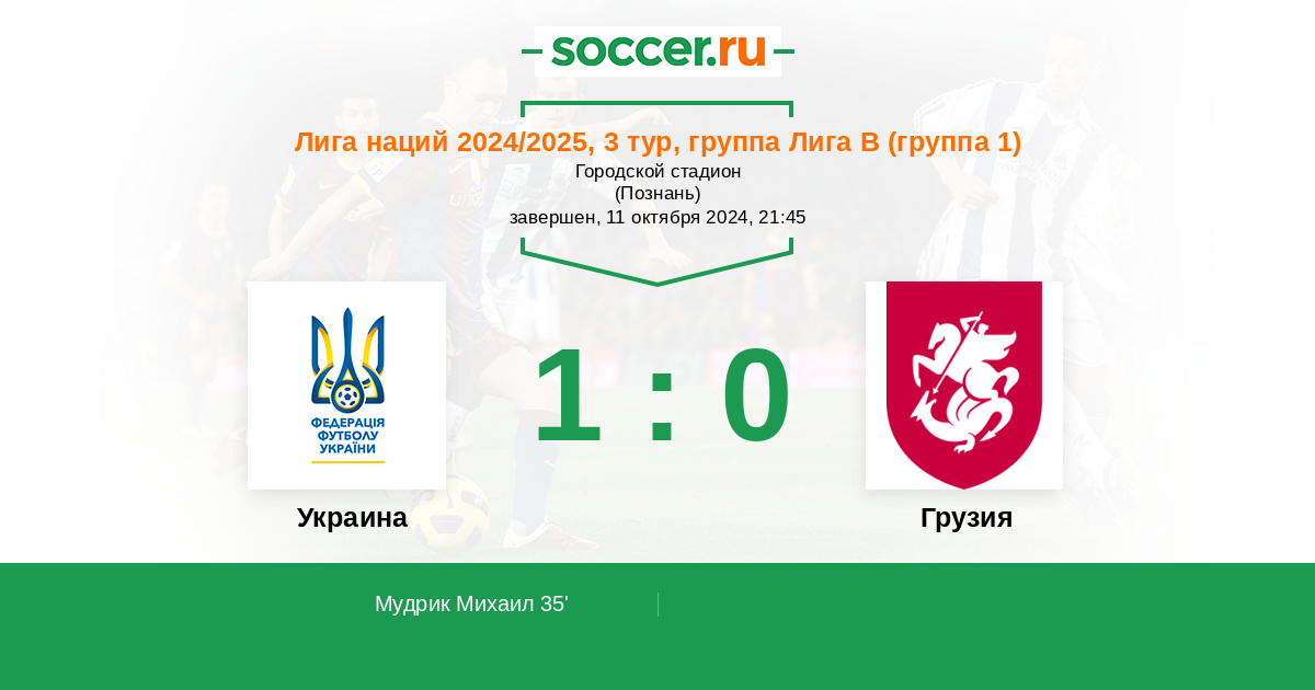 Встречаются участники последнего чемпионата Европы по футболу. Правда сборная Грузии выступила там гораздо лучше, чем сборная Украины. Грузины и сейчас играют лучше. В этой группе ещё не было ничьих. Сегодня будет. Счёт 1:1