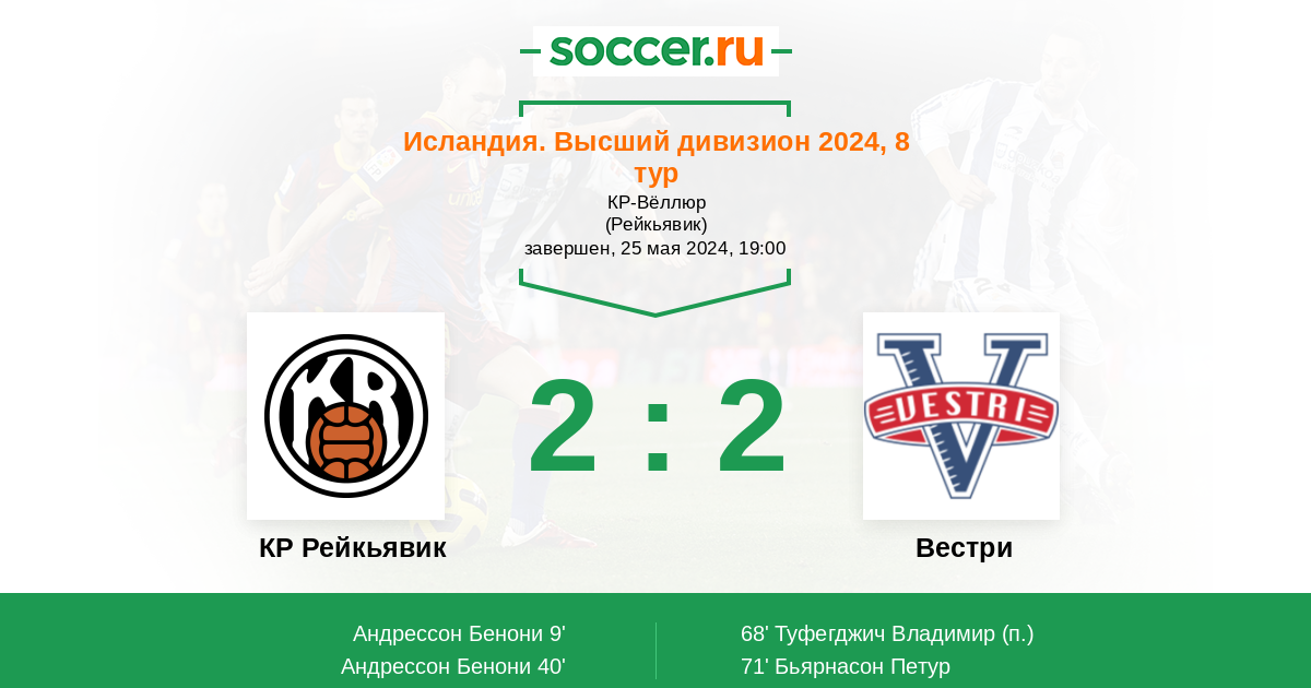 9' (1:0) Андрессон Бенони (9) (Сигурдарсон Арон (11))