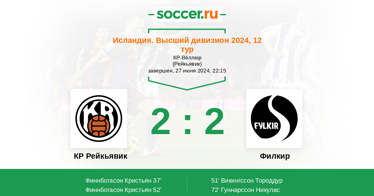 52' (2:1) Финнбогасон Кристьян (10) (Сигурдарсон Арон (11))