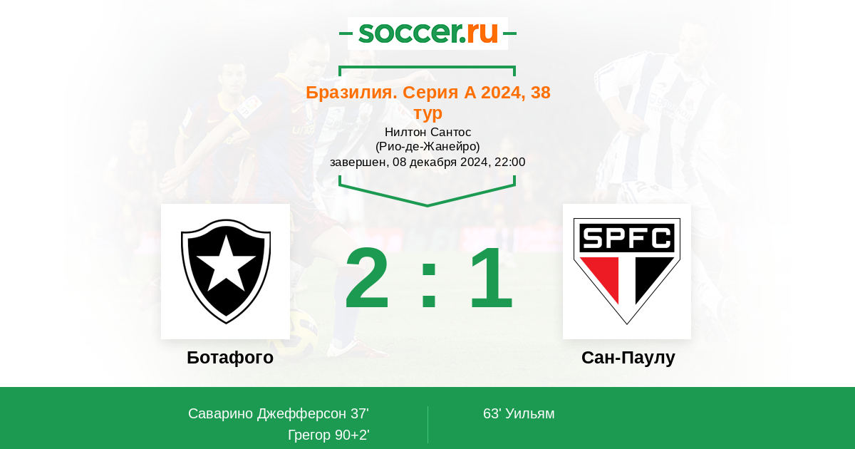 37' (1:0) Саварино Джефферсон (10) (Игор Хесус (99))