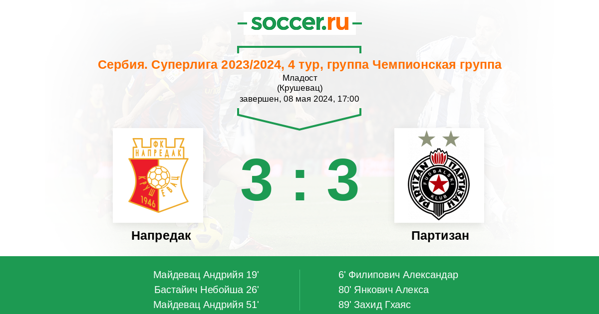 19' (1:1) Майдевац Андрийя (55) (Томич Бранислав (10))