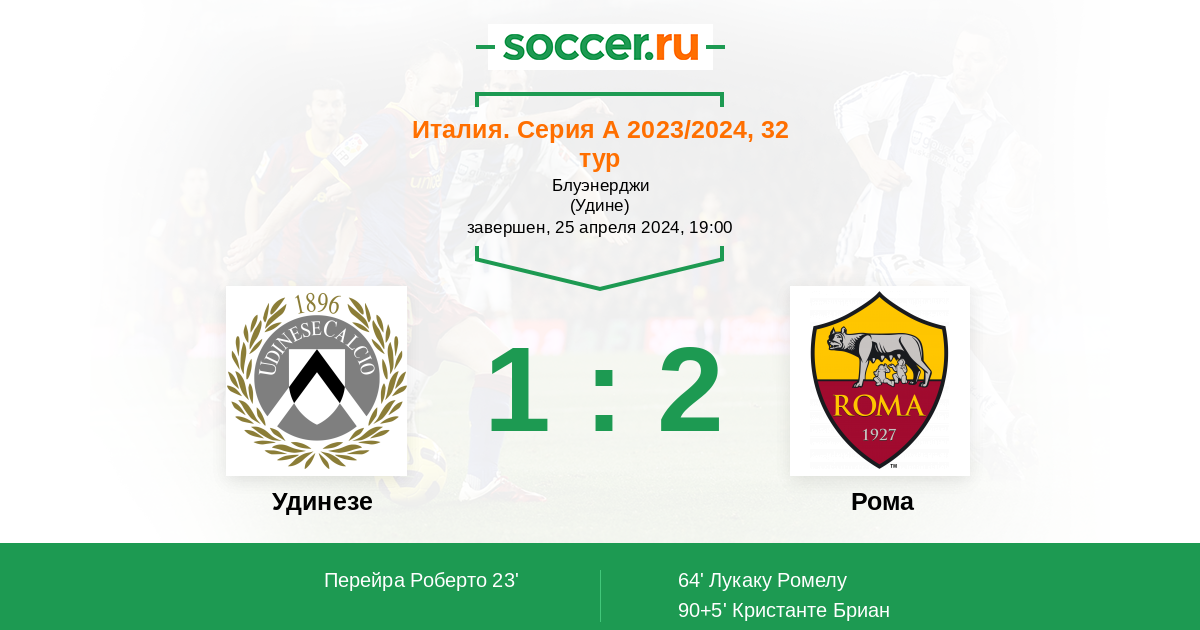 64' (1:1) Лукаку Ромелу (90) (Кристанте Бриан (4))